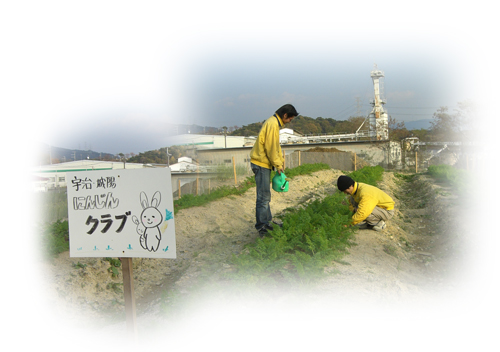 | 京都養鶏の敷地内に発足した宇治・城陽にんじんクラブも早いもので半年になります。夏の日差しの中で汗と種を落とし、今ではにんじんの葉は鮮やかな緑をたたえています。 農産物など植えられたことの無い土地に畝を作り、石をひらい堅い土と格闘して、ほんの少し畑らしくなってきました。最初は大型ショベルカ−でつくってもらった畝を見て、‘これに枕木とレ−ルを敷くと京阪電車が走れるぞ’と大笑いしました。 作物とは、自然とはやはり力強くしぶといものだと感心します。 休耕田は年々広がり、農家は年々減っていっても、それでも新しい畑(モドキ?)と素人生産者は生まれています。 わずか三畝のにんじん畑ですが、元気に育つことを願い職員は毎日交替で畑へ水やりに通いました(にんじんの植わっている30センチ幅だけ砂地にしたため保水力ゼロ)。畑のすぐそばにイノシシの足跡がたくさん見つかり大急ぎでイノシシよけの柵を作りました。柵がどんなものか想像できない職員もいてヘンなもの?を準備したり・・。皆で大笑い。それでもなんとかりっぱな柵ができました。 2005年12月4日の収穫日には、会員さんと職員、80名以上が集います。 沢山の人達と一緒に自然の恵みに感謝したいと思います。 京滋センタ− 村上 忠政 |