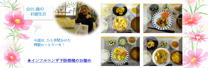 これから次第に寒くなり、毎年のことながら今年もインフルエンザが流行る時季がやってきます。高齢の方が罹ると、急激に悪化したり、それが原因で合併症を起こす危険も予測されますので、早めに予防接種を受けておかれると安心ですね。ご利用者様募集中