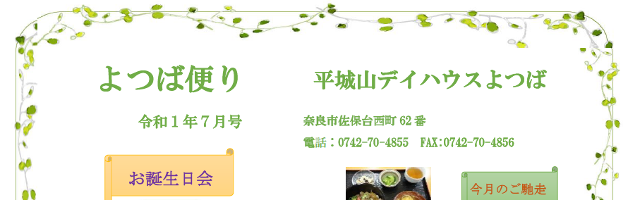 よつば便り	平城山デイハウスよつば	2019年4月号	平城山市佐世保西町62番	電話:0742-70-4855	FAX:0742-70-4856